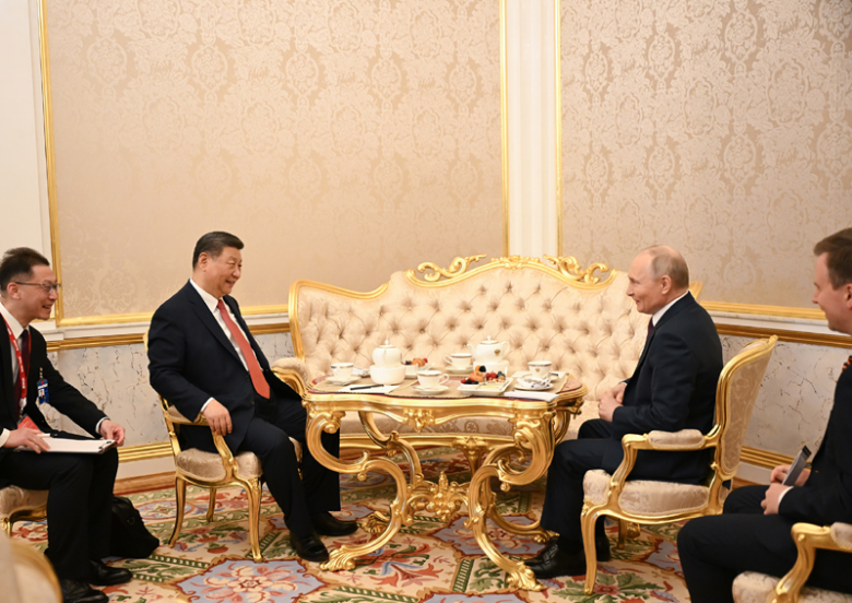 当地时间5月8日下午,俄罗斯总统普京同中国国家主席习近平在莫斯科克里姆林宫总统办公室进行茶叙。新华社记者 谢环驰 摄